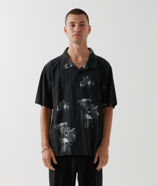 全体的にバラのデザインが施されているレーヨンシャツ。